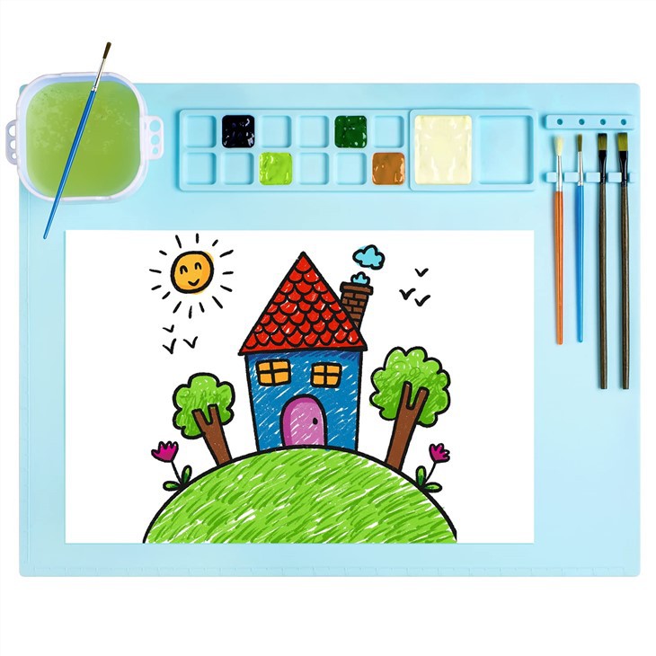 3. Ova ažurirana silikonska umjetnička prostirka ima dvije velike okrugle ladice za boje za učinkovito miješanje, sklopivu čašicu za čišćenje kista i mogućnost korištenja kao palete za boje i palete. Ova silikonska podloga za kreatore ima ljestvice s lijeve i donje strane koje su praktičnije za vašu umjetničku produkciju.